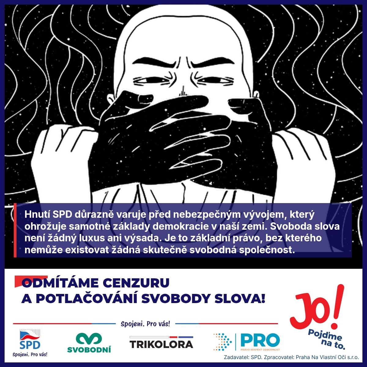 Hnutí SPD tento nebezpečný trend zásadně odmítá, a proto nabízíme občanům podepsat petici „ZA SVOBODU SLOVA“ – jako obranu proti cenzuře, proti státem organizovanému umlčování lidí a proti návratu totalitních praktik do české politiky. Tuto petici můžou občané podepsat u petičních stánků SPD, které najdou v ulicích našich měst v rámci probíhající volební kampaně.