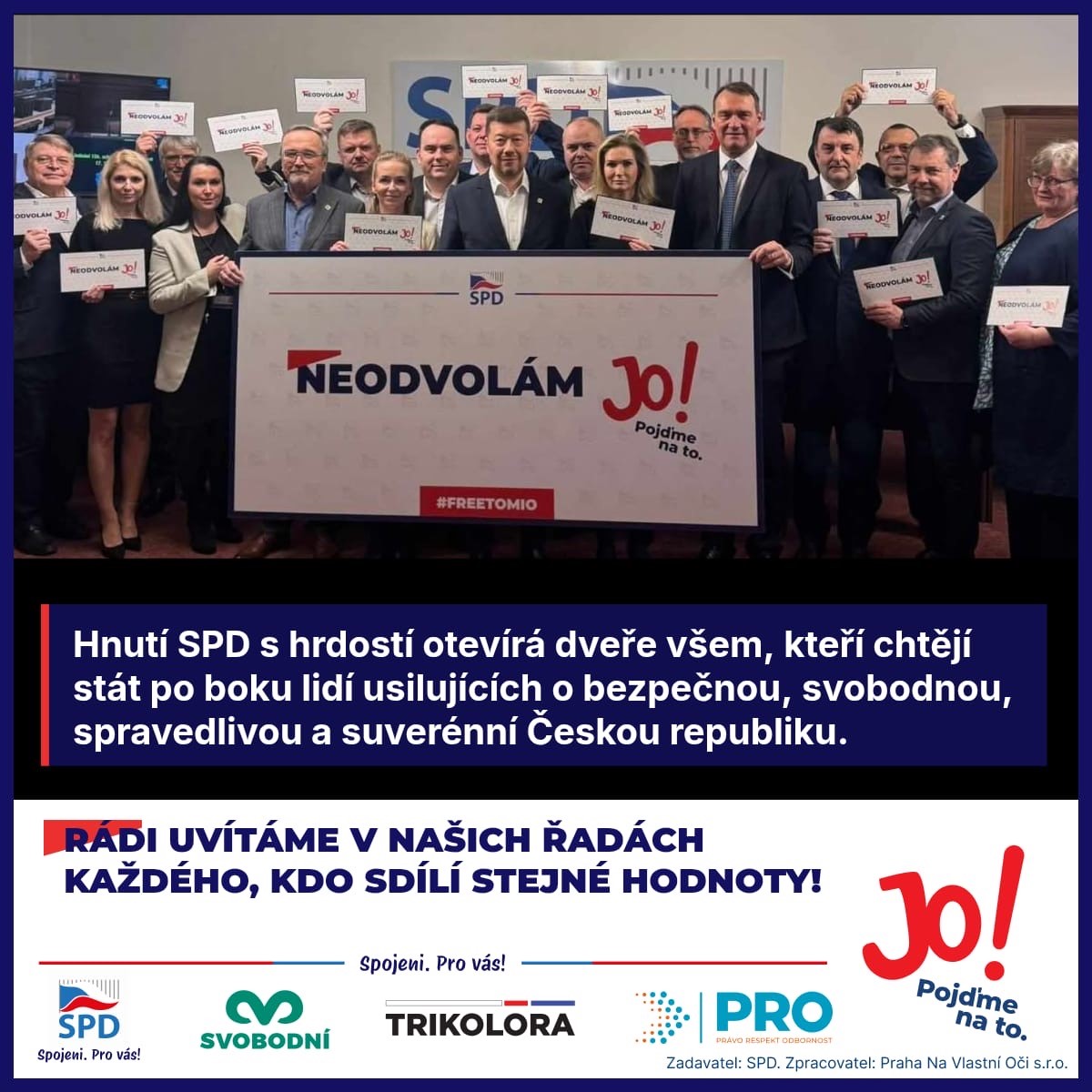 Hnutí SPD s hrdostí otevírá dveře všem, kteří chtějí stát po boku lidí usilujících o bezpečnou, svobodnou, spravedlivou a suverénní Českou republiku.
